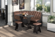 Набор мебели для кухни с классической красивой каретной стяжкой, включающий в себя угловую скамью, стол и два табурета. В угловой скамье под сиденьями расположены два ящика. Каркас выполнен из ЛДСП. Покрытие верхней части столешницы стола - термостойкий пластик, кромка ПВХ – 1 мм. Углы столешницы закруглены для избегания травмирования и придания лучшего эстетического вида.